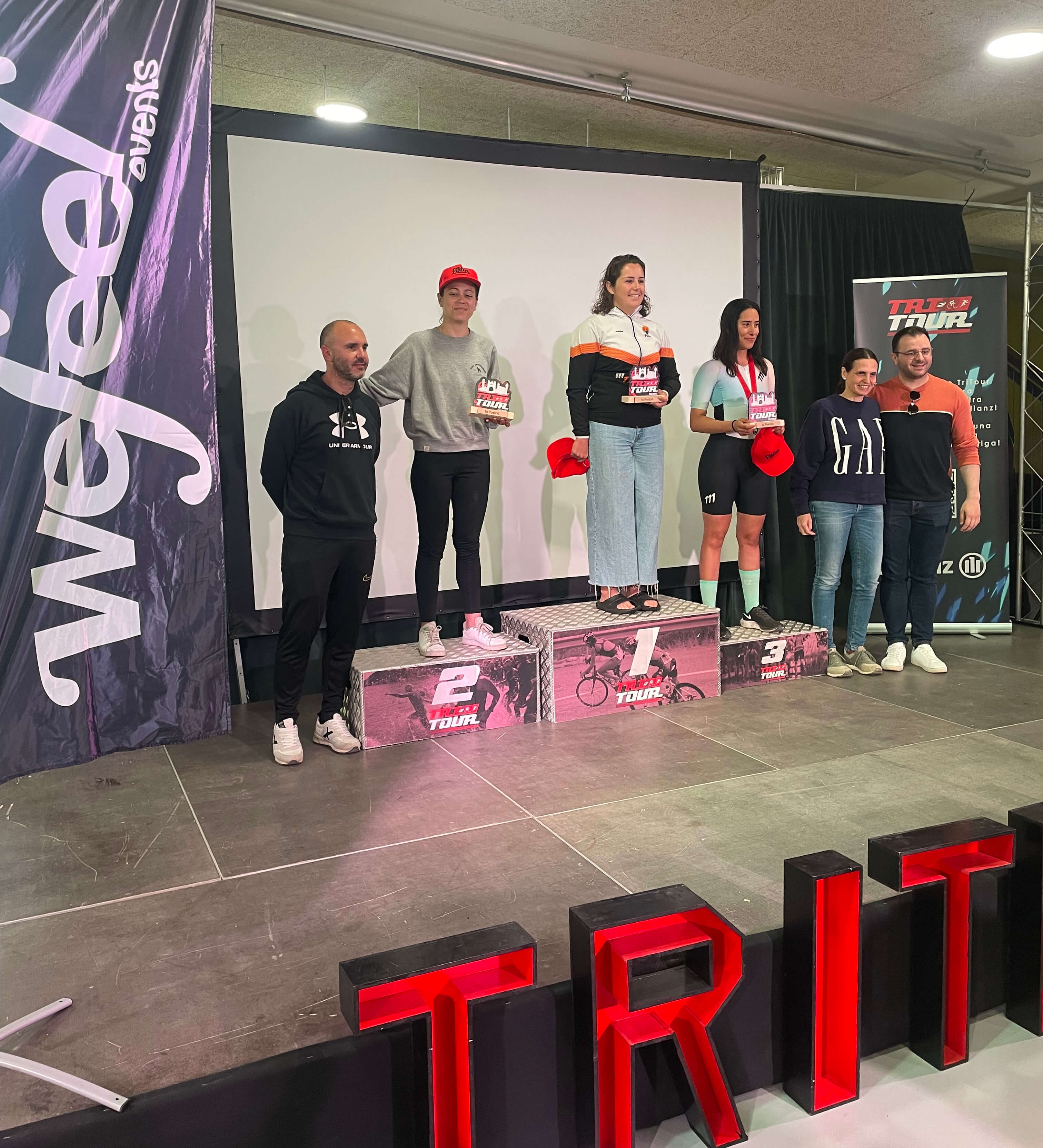 No tengo ni idea de en qué posición voy, pero creo que no tiene que ser mala. Sé que he hecho una buena bici. Entro en boxes corriendo, y veo a Lluc y Ricard sentados en el suelo animándome. Felicidad suprema: haber terminado, la satisfacción de que las cosas me hubieran salido bien al final y encima ver a mi hijo en meta… Entonces recuerdo por qué hago todo esto y me alegro muchísimo de haberme presentado a competir. Sé que el chip ya no me está marcando y voy andando descalza hasta el arco de meta. Cuando estoy entrando, veo a otra chica con el dorsal rojo del Aquabike detrás de mí. Y oigo al speaker: “¡Y aquí tenemos a la segunda y tercera clasificadas del Aquabike!”. Nos cogemos de la mano y entramos juntas levantando los brazos.