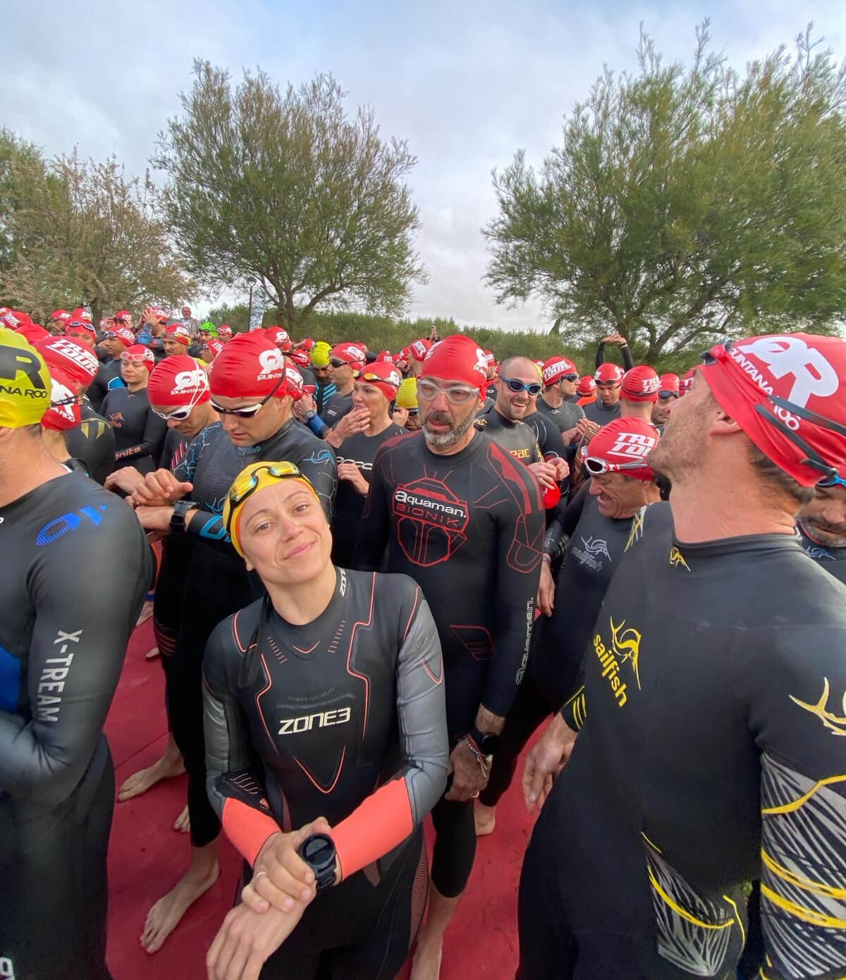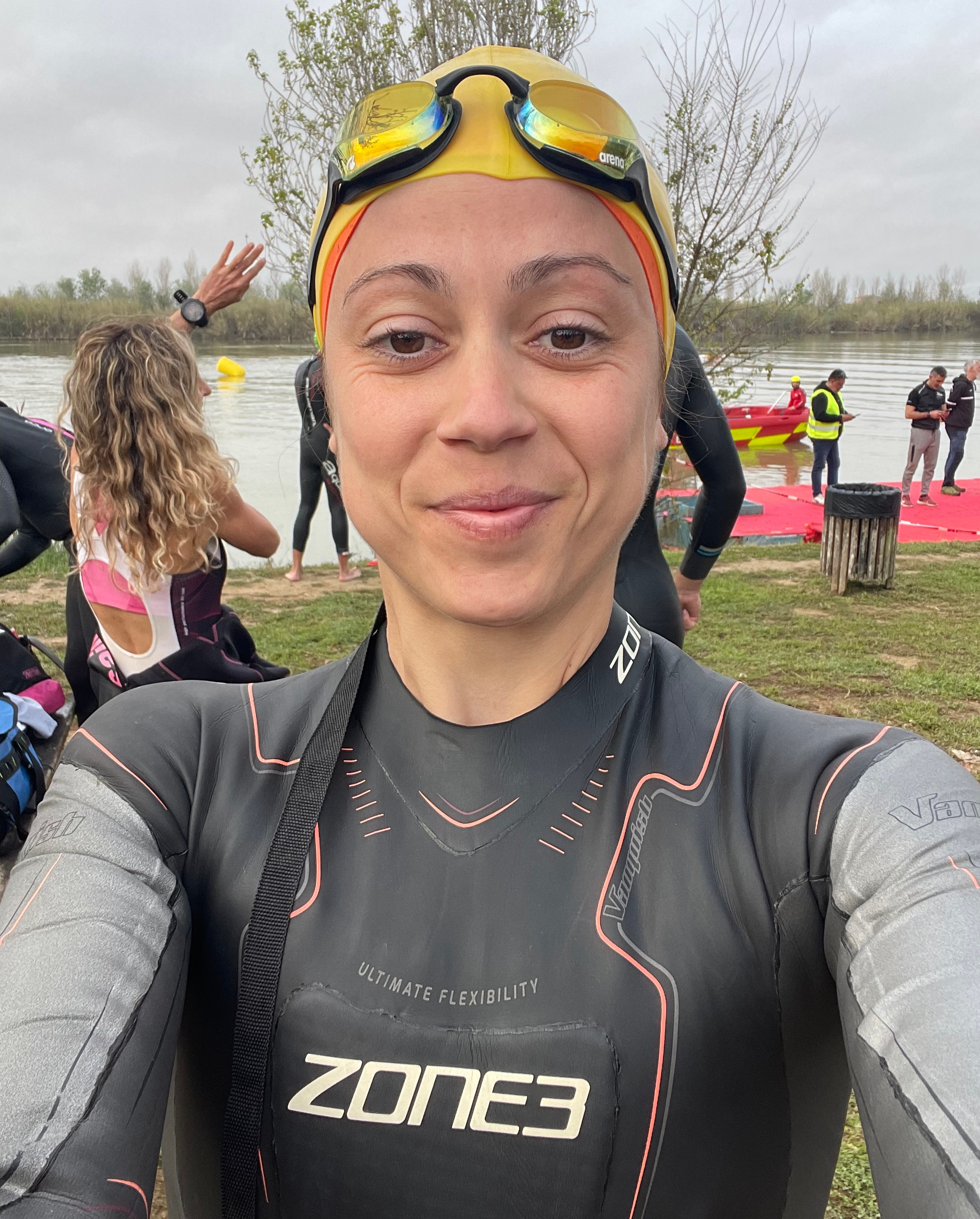 Salto al agua, cuando quedan 2 minutos para la hora de salida. Está congelada. Se me corta la respiración mientras doy algunas brazadas contracorriente como nos han indicado. Meto la cabeza dentro para acostumbrarla al frío. Veo a mi alrededor un montón de gente desperdigada, no parece una salida de un triatlón. Entiendo que esperarán a dar la salida hasta que todos estemos más o menos agrupados en un punto. Veo una boya y entiendo que tengo que ir hacia allí, voy nadando a contracorriente. De golpe, choco con otra persona que va nadando río abajo ya. Saco la cabeza del agua y veo que todo el mundo ya está dando brazadas enérgicas en la dirección correcta. ¡Mierda! Han dado la salida y no me he enterado. ¡Pero qué injusto! Tendrían que habernos agrupado, había mucha gente en una posición súper aventajada. Pero ya no importa, esto ya ha empezado, y yo, como puedo, aprieto el botón de Start del reloj. “El peor inicio de una competición en toda mi vida”, pienso. “Ni siquiera me he enterado”. Empiezo a nadar río abajo con toda la multitud, ahora sí. Pero estoy nerviosa, la he cagado. Entre el frío y los nervios, noto que llevo las pulsaciones por las nubes. Pero cojo un buen ritmo y adelanto a bastantes personas. Empiezo a dar más fuerte con los pies, son pocos metros así que no voy a reservarme. Cuando ya empezaba a ir cómoda, trago un montón de agua, y me quedo sin respiración. Con las pulsaciones tan altas, no puedo permitirme desperdiciar ni una pizca de oxígeno… y aquella bocanada de agua me mata. Toso, intento que me entre aire como sea. Empiezo a agobiarme muchísimo. Me recupero un poco y sigo. Cuando había acompasado de nuevo el ritmo de la respiración, pam, otra vez. Bocanada de agua, y esta vez tengo que parar del todo. Abro la boca como un pez para que entre oxígeno, súper agobiada. Me pongo a nadar de espaldas, para no entorpecer tanto a los demás y avanzar algunos metros pese a estar muy apurada. Me adelantan muchas personas. Mierda, mierda. Desmotivada, sigo nadando, pero sé que he perdido muchas posiciones. Adelanto a gente, pero, con lo corto que es el recorrido, no me da tiempo a volver a situarme en una buena posición. Visualizo el punto donde salimos del agua, al lado de un puente. Veo que hay otro puente, mucho más bajo, justo antes de llegar a meta… lo que no veo es que tiene una pilastra gigante contra la que casi me estampo. “Ya van dos, vaya día llevo”, pienso. Llego al pantalán donde termina el segmento de swim. Cojo la mano de los voluntarios que nos ayudan a salir. “Menudo desastre de segmento”, pienso.