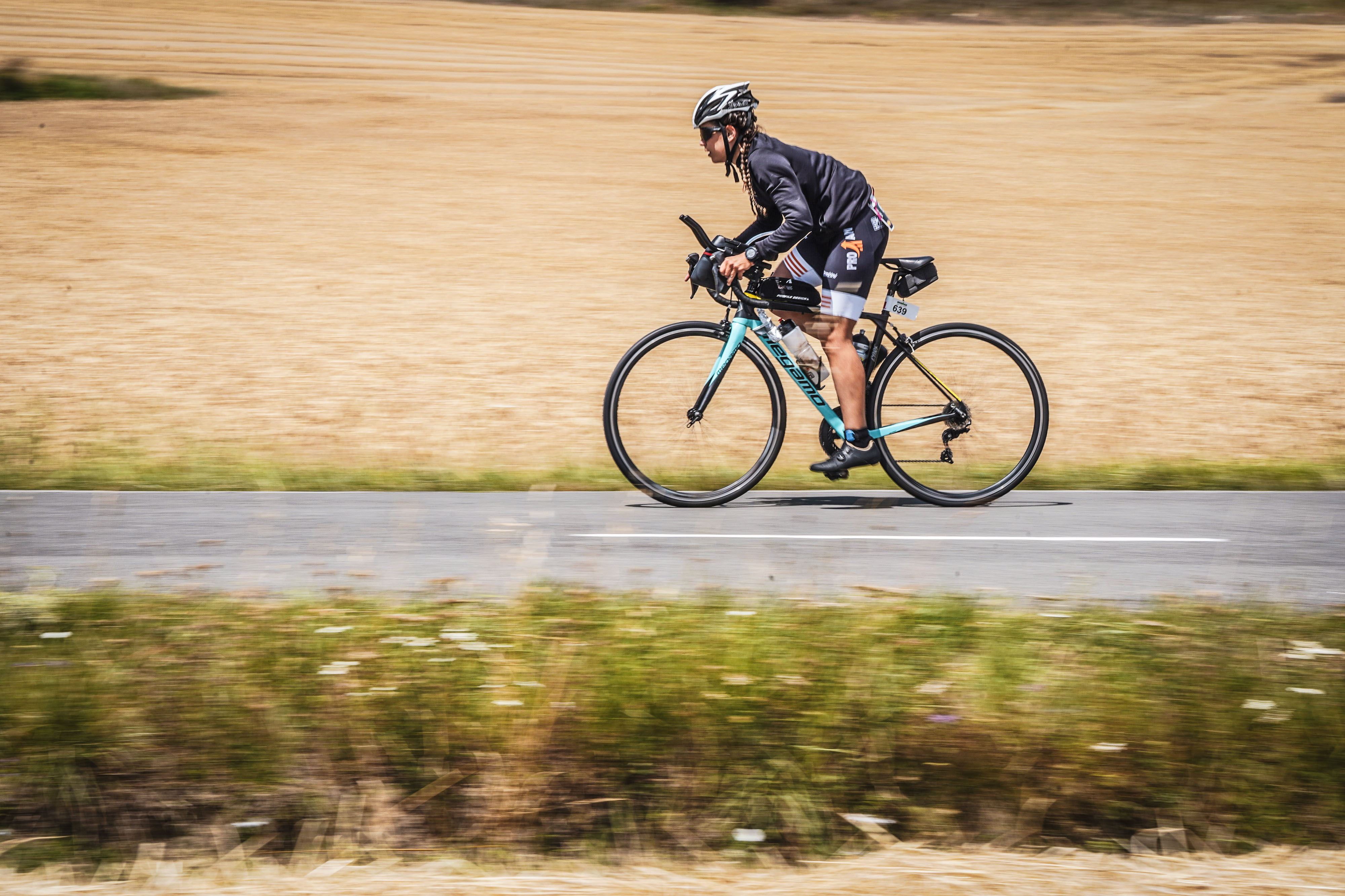 Ya tenía decidido que no me estresaría en las transiciones, que me tomaría mi tiempo para no cometer ningún error. Los errores en un Ironman se pueden pagar caros y a mí las prisas suelen jugarme malas pasadas. Prefiero mantener la cabeza fría y pensar las cosas varias veces. Me encuentro a mi compi Fede, nos saludamos rápidamente y él se va. Yo me saco el neopreno con cuidado, me seco los pies y me pongo calcetines y las calas. El casco, las gafas, los manguitos y una chaqueta. No quiero pasar frío, a mí el frío me roba mucha energía. Siempre puedo quitármelo si luego me sobra. Voy trotando hacia la bici, la encuentro rápidamente porque está muy bien indicado. Me dirijo hacia la salida de la T1 con la bici sujeta por el sillín y, tranquilamente, me subo cuando el juez lo permite. Empiezo a pedalear: comienzan los 180 km. Son 2 vueltas de 75 km y una de 30. Tengo que concentrarme en comer y beber lo que tengo planificado por el nutri Marc, si no quiero cagarla. Los primeros km voy algo insegura. Como era de prever, me adelantan todos los cracks. Intento no hacer mucho caso, concentrarme en lo mío.