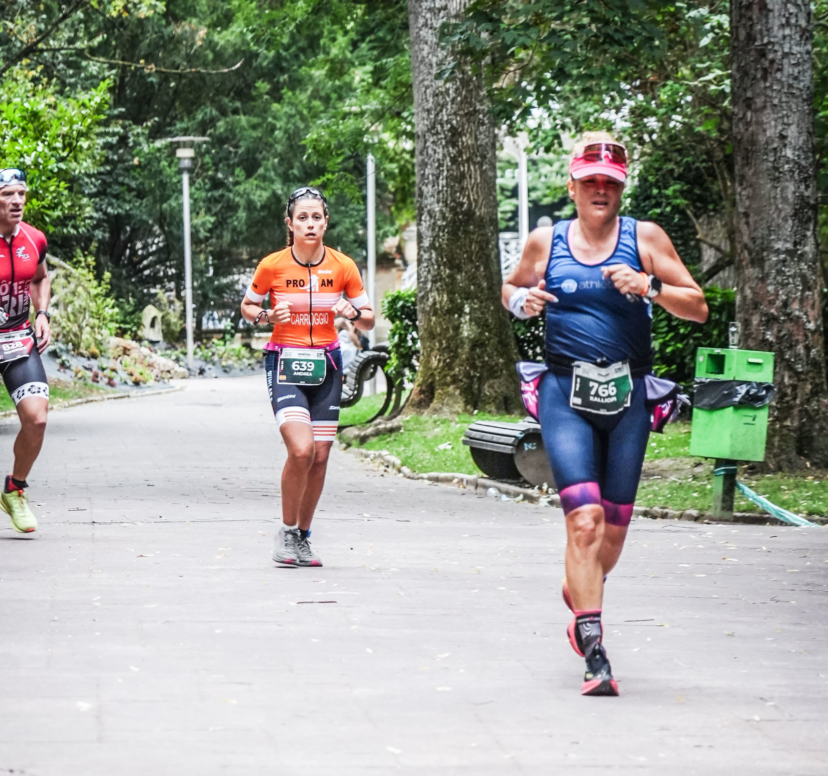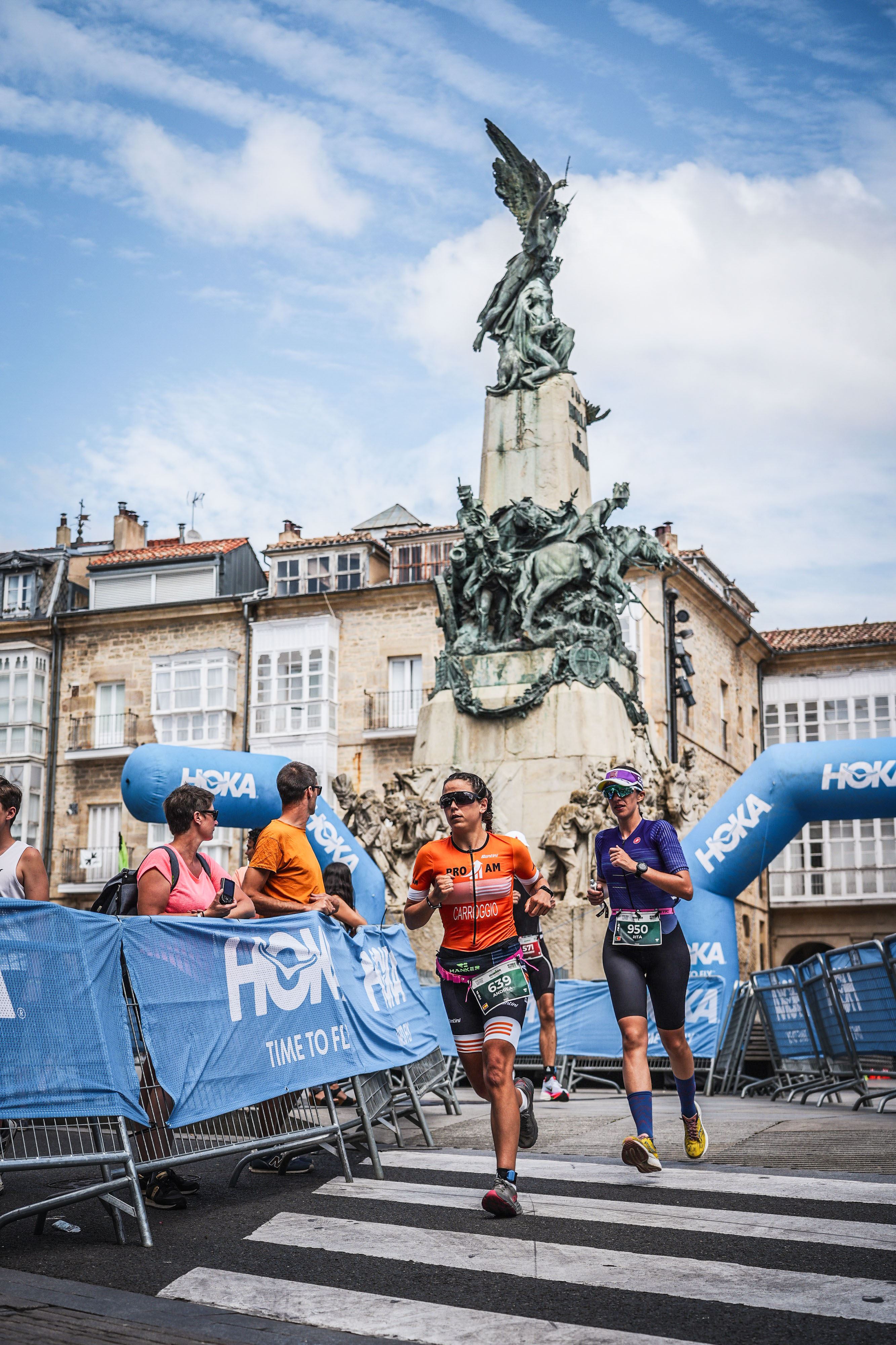 Llego a la T2 entre los gritos de la gente que anima, pero me concentro a tope para bajarme de la bici con algo de dignidad. Sé que estaré muy dolorida y cualquier paso en falso podría hacerme caer y perder tiempo. Me quito las calas y entrego la bici al voluntario que me la dejará en el rack, y yo, calas en mano, voy corriendo a coger mi bolsa de equipación del Run. Pero ¡sorpresa! No puedo correr: no me noto los pies, me duele mucho la lumbar y las piernas me fallan. Voy trotando como puedo hasta la T2 e intento tranquilizarme: "Pasará, seguro que pasará". "Venga, Andrea, a ti te encanta correr, has disfrutado un montón los entrenamientos de run y las tiradas largas: esto es una tirada larga más". Me quito la chaqueta, me cambio de calcetines y me pongo las bambas, y salgo corriendo. El dolor ha mejorado, ahora sí puedo correr.